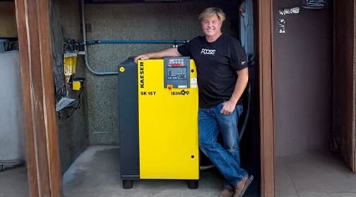 Chip confía en el compresor de tornillo rotativo KAESER SK 15T para alimentar su taller. Con su secador integrado, funcionamiento silencioso y eficiencia energética, proporciona aire limpio y confiable para pintura, fabricación y herramientas de precisión, lo que lo convierte en la solución perfecta para los altos estándares de Chip.
