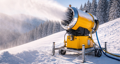 Cañones generadores de nieve accionados por aire comprimido en una estación de esquí.